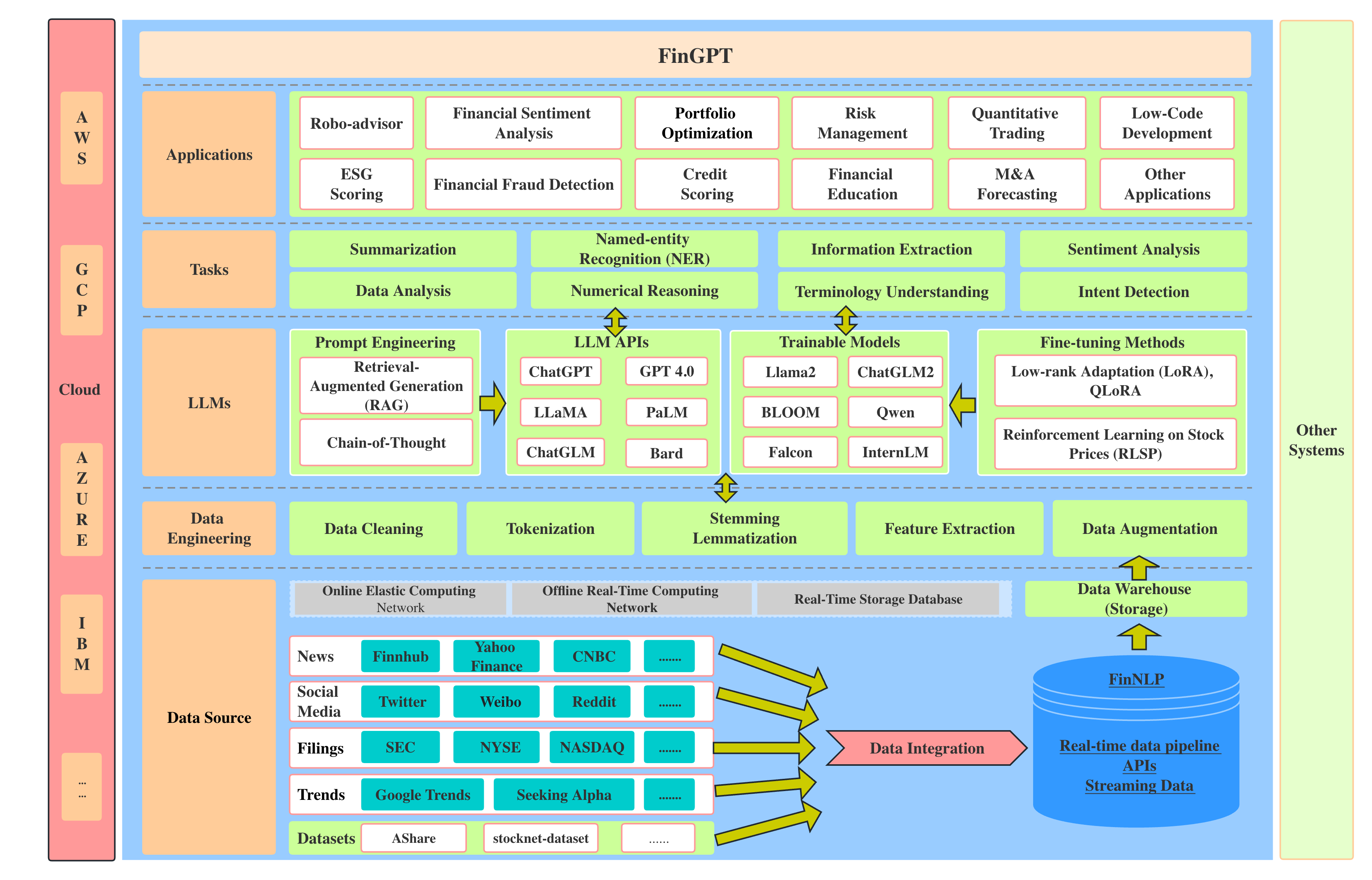 - FinGPT-FinNLP: FinNLP provides a playground for all people interested in LLMs and NLP in Finance. Here we provide full pipelines for LLM training and finetuning in the field of finance. The full architecture is shown in the following picture. Detail codes and introductions can be found here. Or you may refer to the wiki