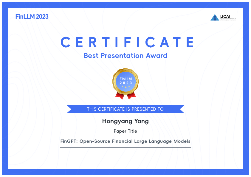 - [Paper Acceptance] Jul, 2023: "FinGPT: Open-Source Financial Large Language Models" is accepted🎉 by FinLLM 2023@IJCAI 2023
