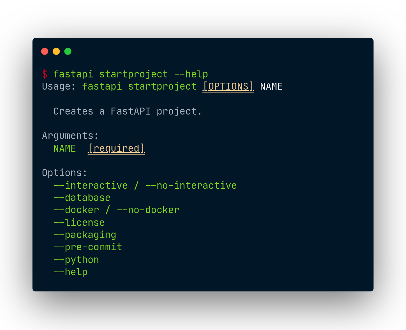The idea is to have a highly customizable CLI, but at the same time a simple interface for new users. You can see the available options for startproject running fastapi startproject --help: