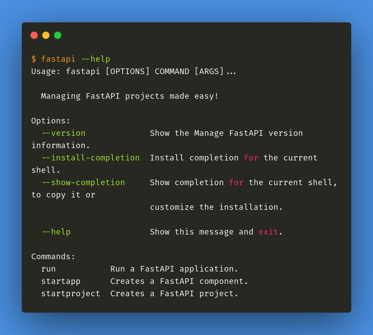 Manage FastAPI has three commands for now. You can list them by running fastapi --help: