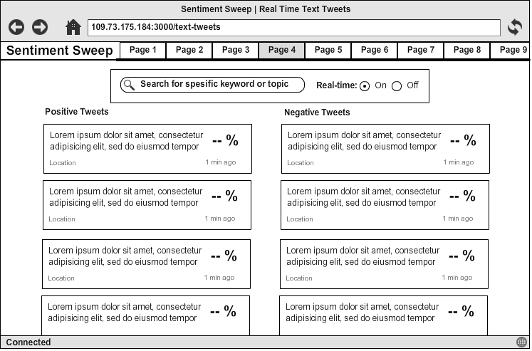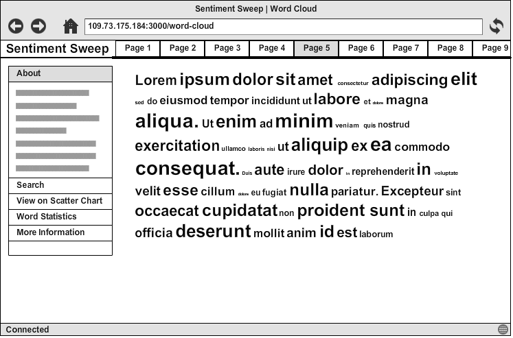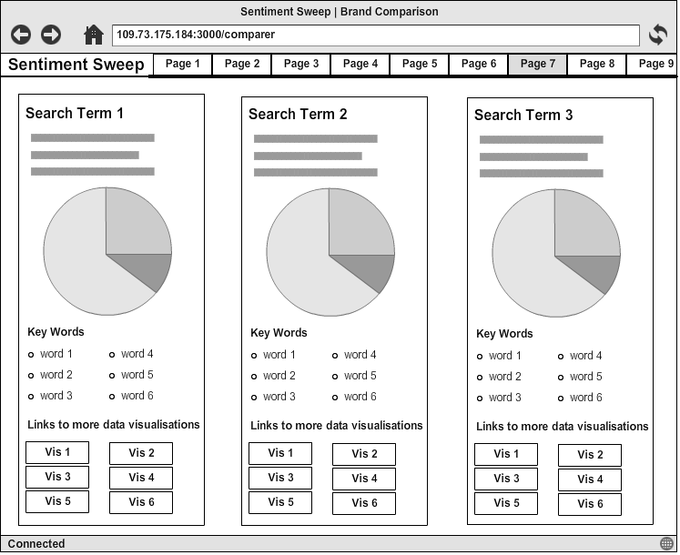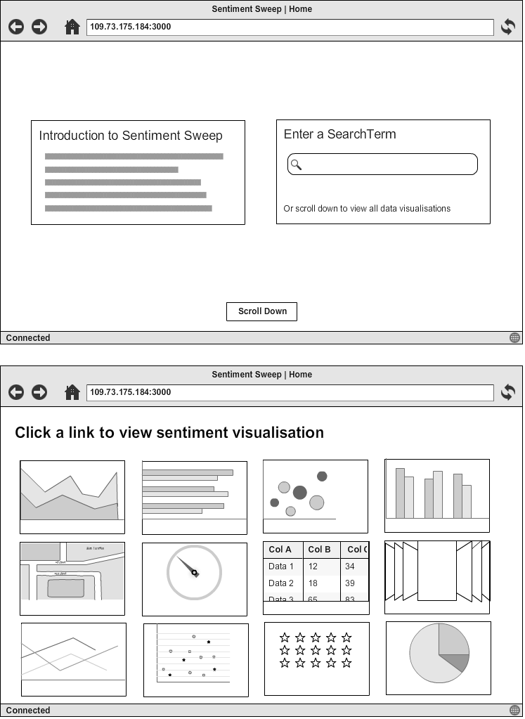 All pages (with the exception of that start screen) will follow the same format in terms of data source. Upon landing on the page, results will be calculated on tweets that are cashed from the backend streaming engine, and up to 60 minutes’ old. The user can then make a search (or add /[search-query] onto the URL). This will fetch a fresh set of tweets, and render the data visualisation based on this new data. This is explained more in the backend section of the methodology.