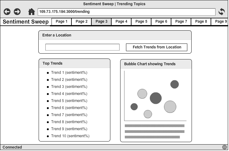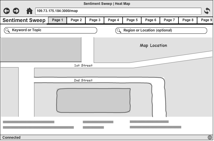 As the mockup shows, the navigation bar is the same as on the other screens. There are two input fields where the user can enter either a topic, or a region. Preceding that is the regional map- it should be noted that this is not a detailed map like the one on the heat map page. The map will show regions, where sentiment is represented by a solid color. It will be possible for the user to hover over a region to view more information. Below the map there will be two lists. The first list will show the top ten most positive regions for the users search term, and the second list will be top ten most negative regions. Again the items in the list will be clickable, and will also show sentiment value as a percentage.