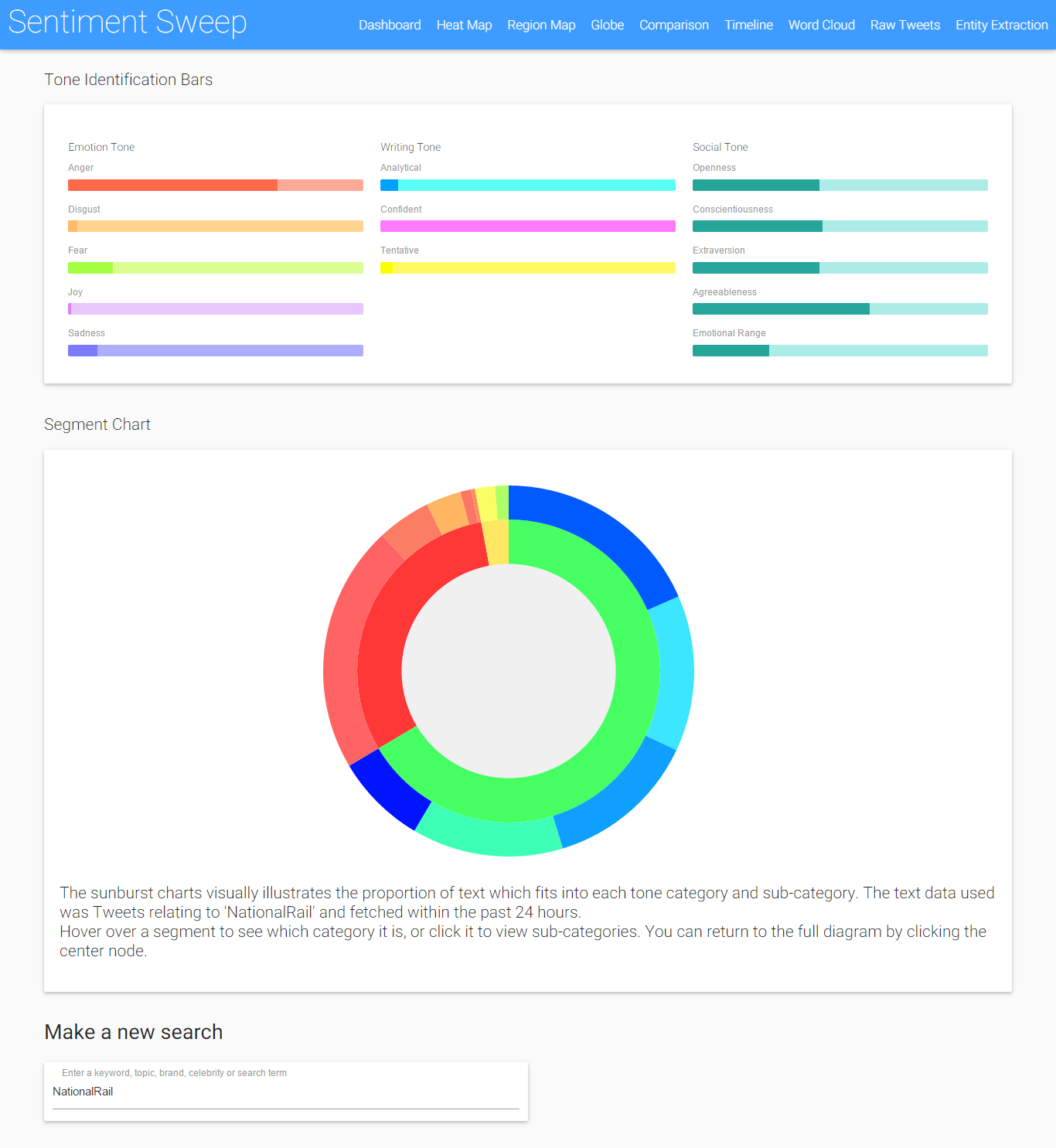 This can sometimes be much more useful than displaying the positive: negative ratio for a topic. Results are displayed with CSS data bars, and with a zoomable segment chart developed in D3.