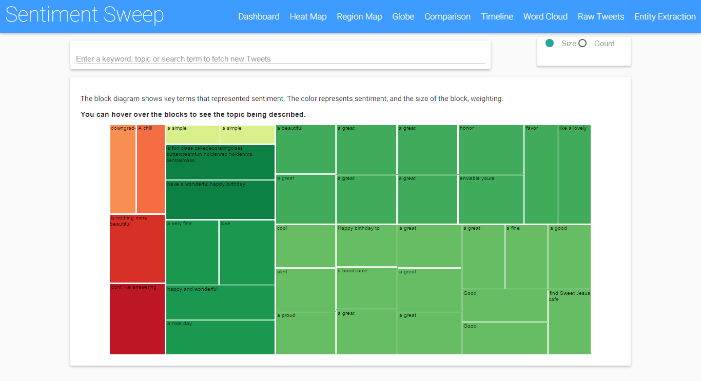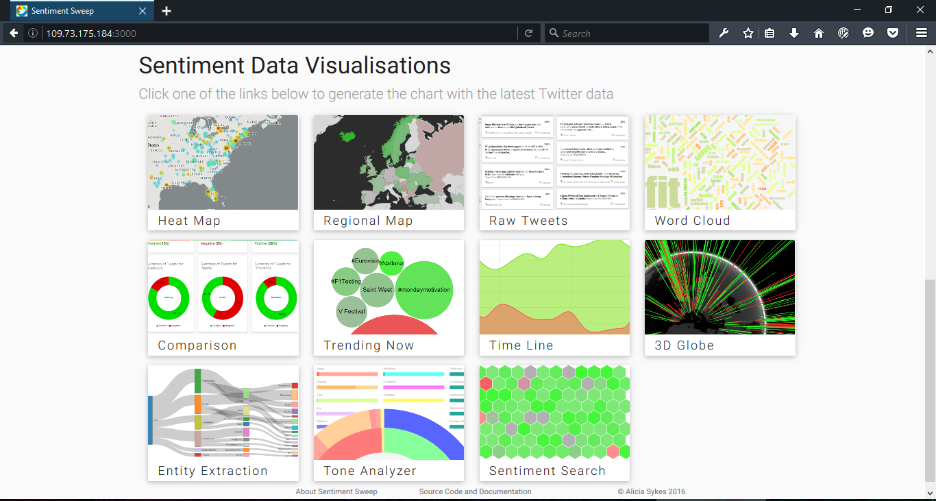 This data visualisation is a bit of fun, it shows sentiment geographically either for all Tweets over the past 60 minutes, or for a specific search term. Green bars = positive, and Red bars = negative, where the height of the bar represents the volume of Tweets from that area. The globe can be rotated wither with mouse or touch screen. If the user clicks "More data" they can see key stats about the info shown on the globe.