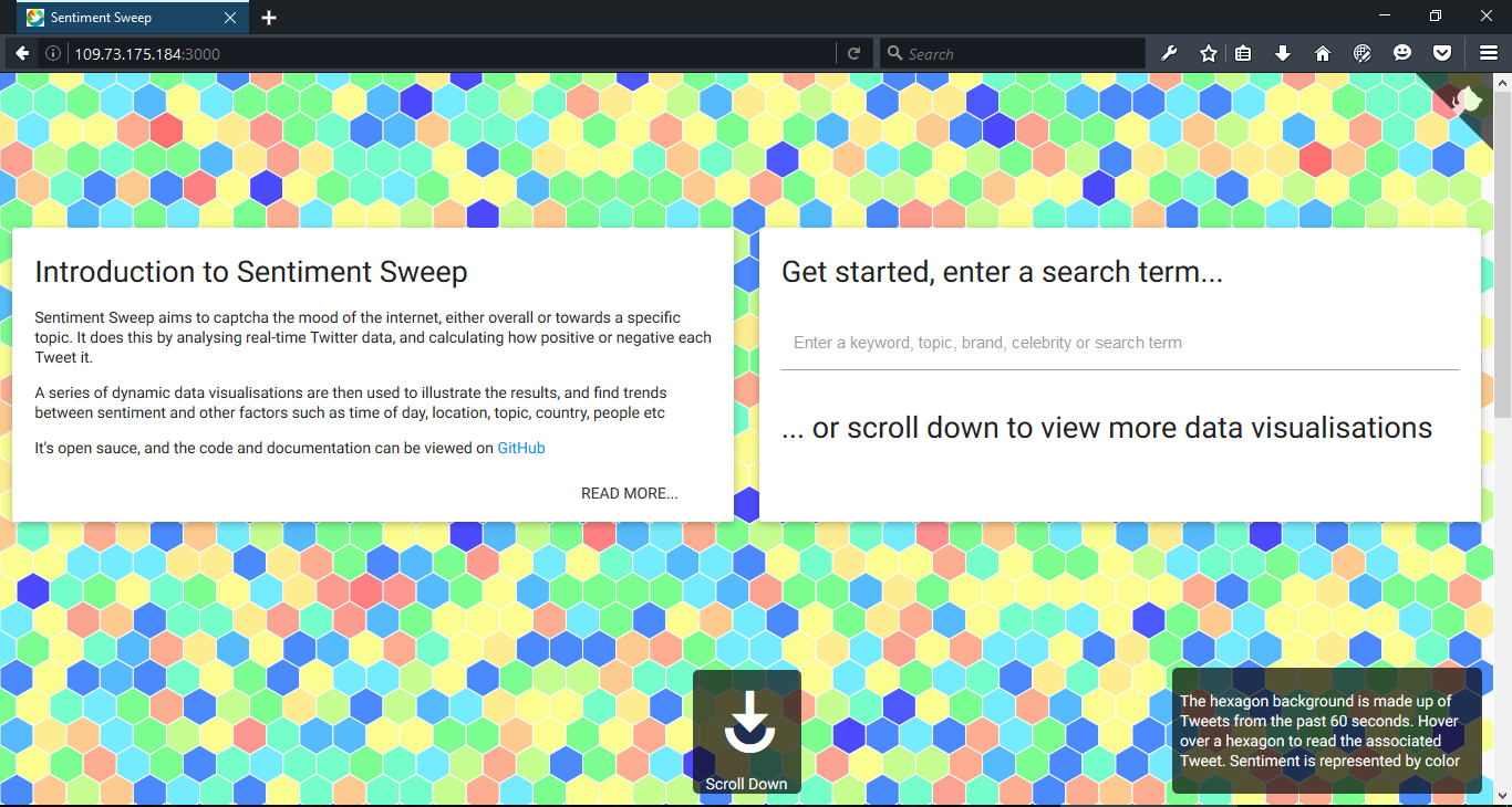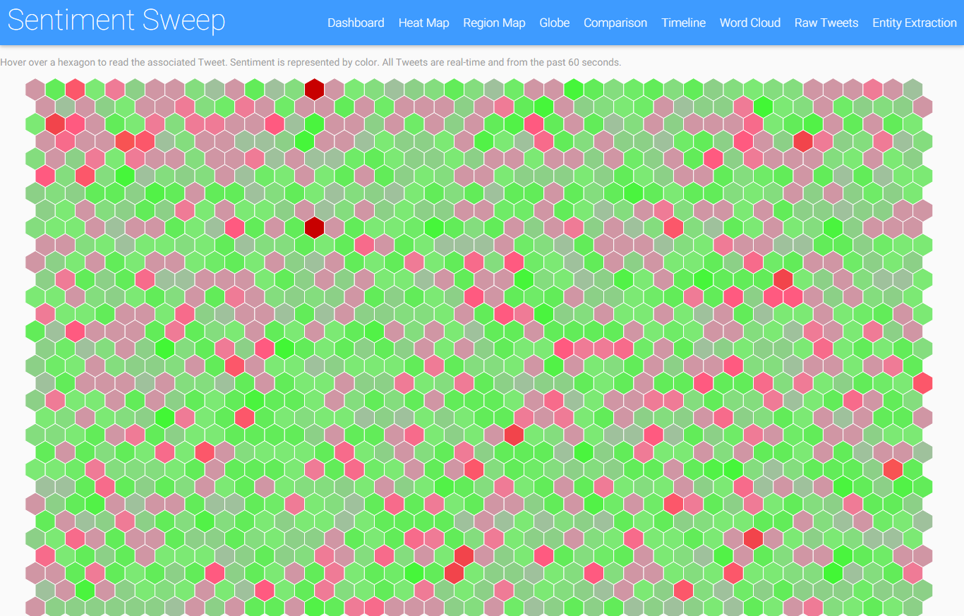 The background is made up of colourful hexagons, where each one represents a Tweet, and the color indicates the sentiment (blue to green = positive, yellow - red = negative, and the shades of colours inbetween show sentiments inbetween accordingly). When the user hovers over a hexagon they can see the associated Tweet and key information about it. All Tweets are real-time so the hexagons are constantly changing.