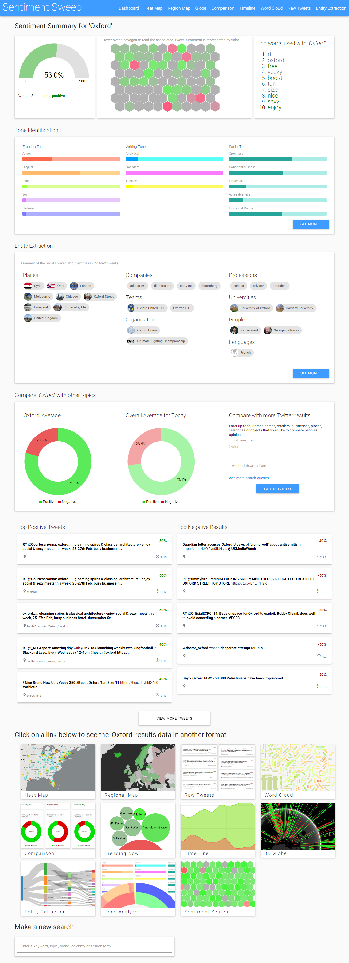The page is split into seven sections, the first of which gives an overall summary of sentiment illustrated with the red and green interactive hexagons (which can be hovered over to read each tweet), a guage showing percentage positive or negative and the keywords trending for that search term and weather each is positive or negative.