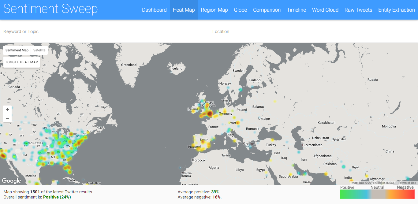 The sentiment heat map, is an interactive map, with a layer overlay that represents sentiment in that particular location by color. Red = negative, and green = positive, all colors inbetween indicate the sentiments inbetween, and grey is neutral.