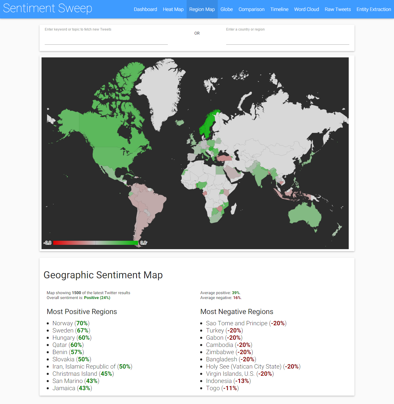 The heatmap is very useful for drilling down to view details about each Tweet in every location for a brand or topic, but often you just want to get a quick overview, such as which regions are most positive or negative towards a specific search term. That is what the regional map is for.