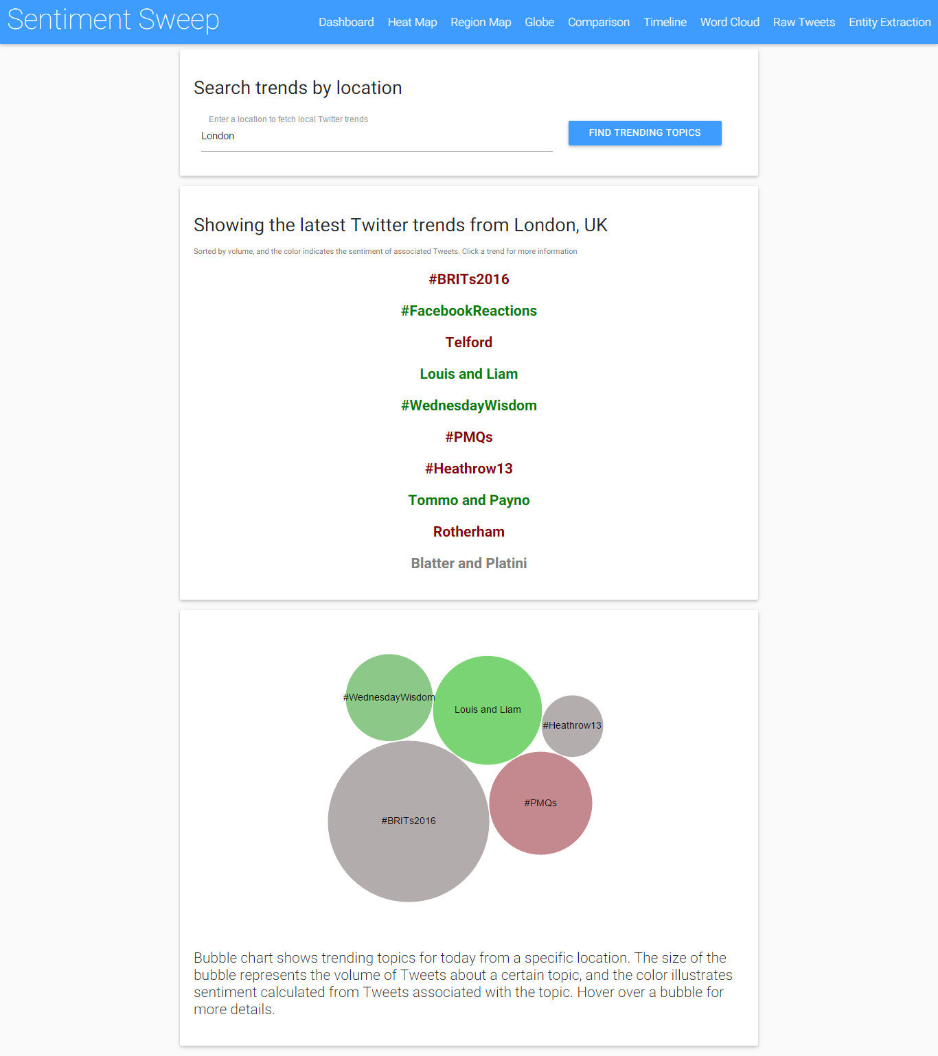 It is also possible to show just local trends, where the user can enter a location - any location, which is then looked up using Google Places API to find the latitude and longitude, and then trends and sentiment is calculated based on just that local area. This generally generates much more relavant and interesting results than world-wide trends.