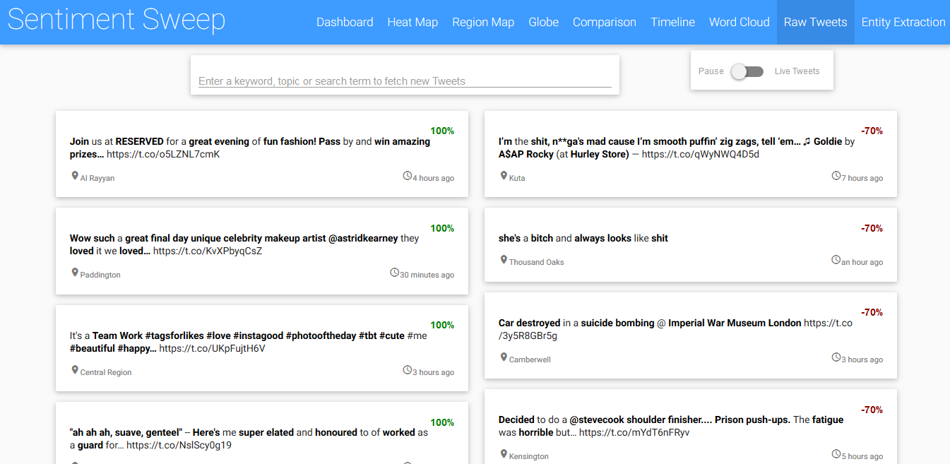 The Tweets are displayed in two columns, split by sentiment. The location (based on the users profile), and the time are also shown. Keywords are higlighted in bold, and are clickable. The sentiment value is given as a percentage in red or green. Tweets are real-time, so new Tweets will show up when they come in.