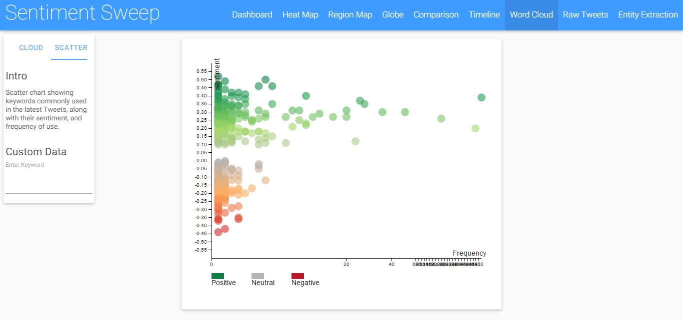 This is another data visualisations for showing words, but in a different form, and able to cope with much larger amounts of data, as well as real-time results. Each point represents a keyword, and the x-axis shows volume of use, and the y-axis show's sentiment. You can hover over a point to view the word, along with more information about it.