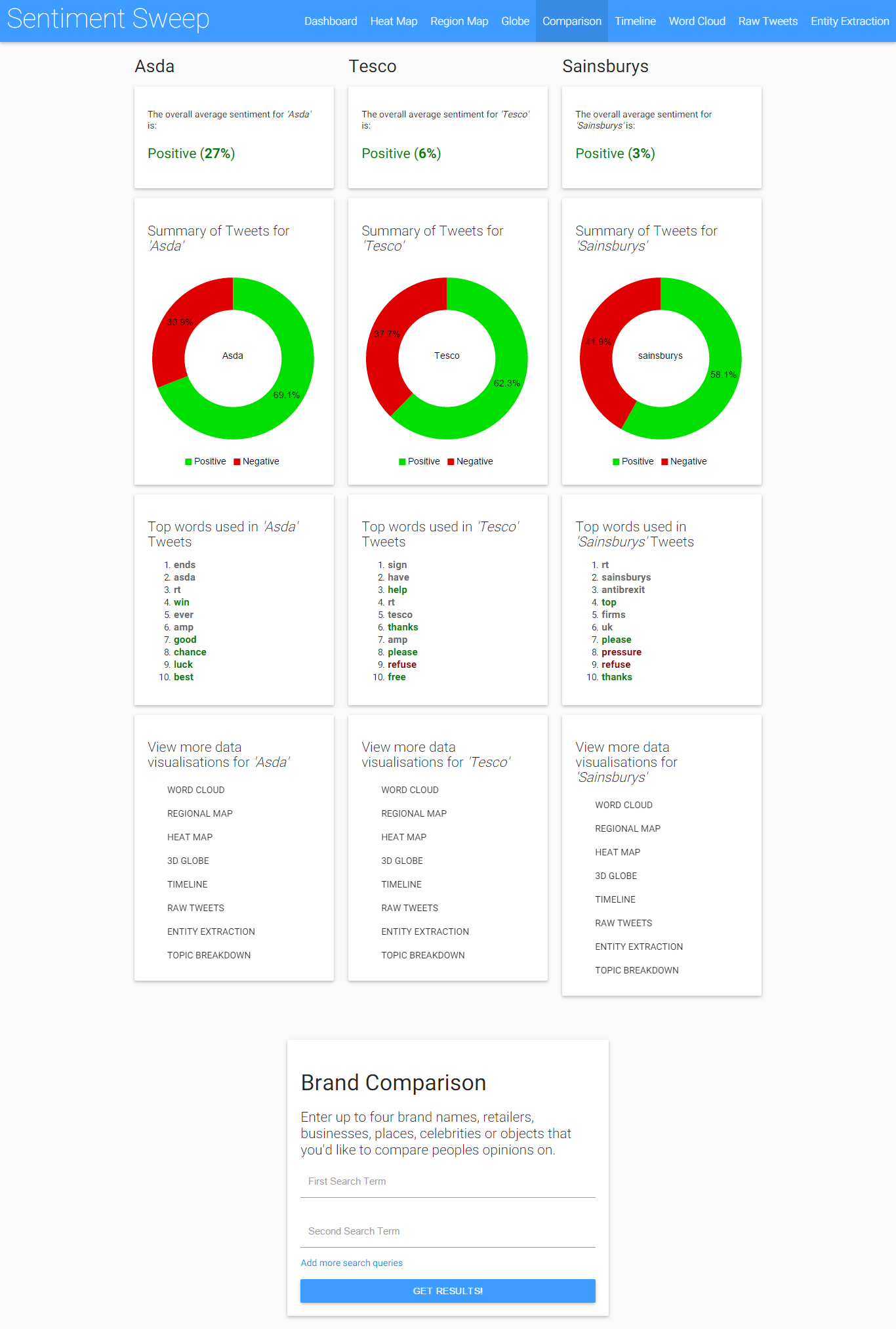 The purpose of this page is to allow the user to compare opinions towards multiple topics. It is mainly intended for comparing brands, but can have many more uses. The user enters up to 4 search terms, and tweets relating to each are fetched, analysed and then visually displayed in the form of a donut chart. The key words and trends from each topic are also displayed below, as this is often very useful for getting a snapshot of why a brand or topic is currently so positive or negative. There are also links to view each of the topics in the other forms listed above, such as timeline, word cloud, geographical map or raw tweets.