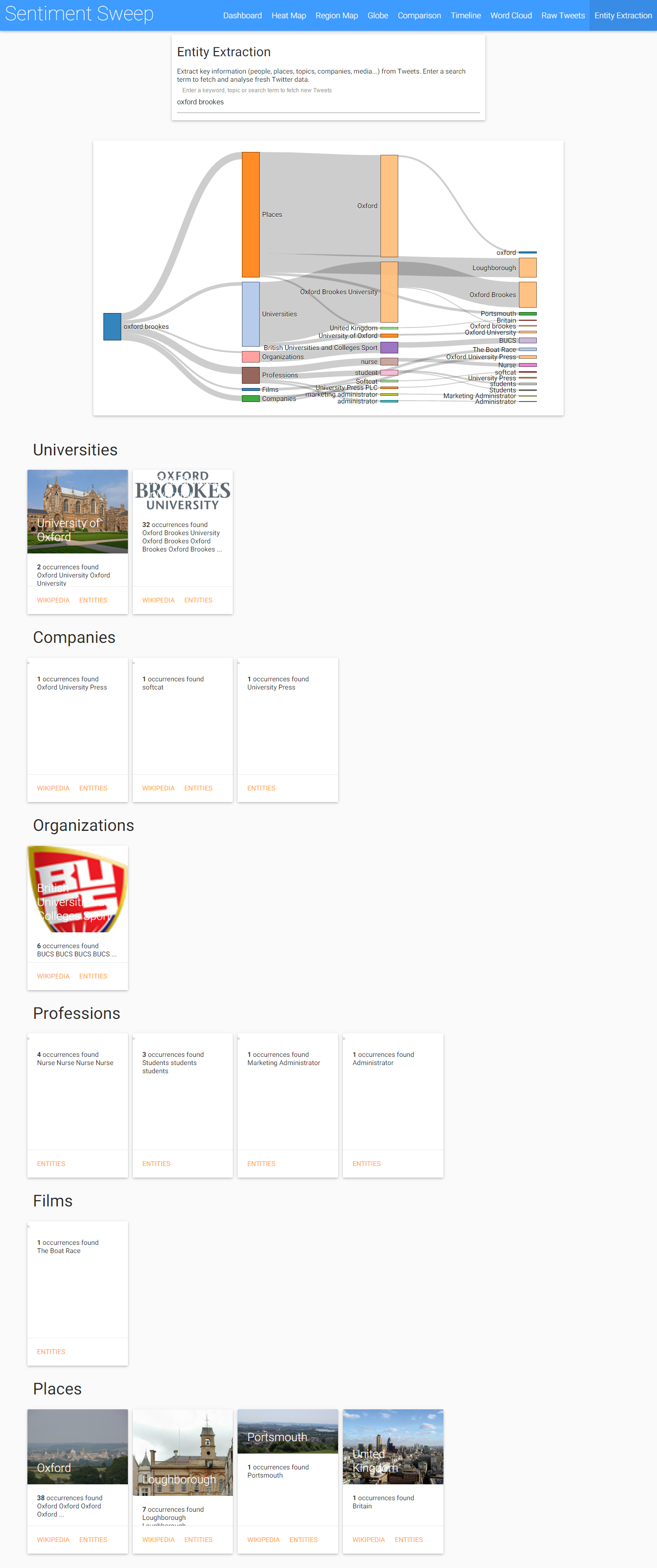 A sankey chart is generated using D3 to show the results from the users search term. There are also boxes below to give more details on each, and pictures/ wikipedia links/ sentiment info...